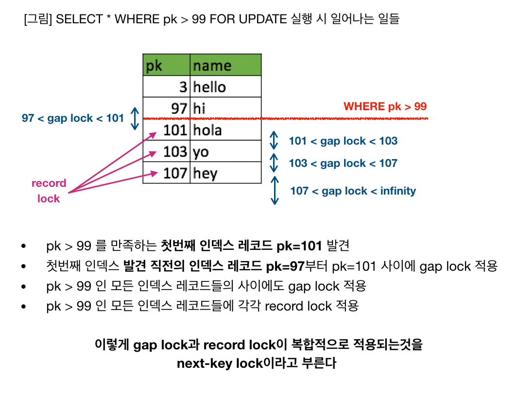 - 예) SELECT id FROM t WHERE id BETWEEN 10 and 20 FOR UPDATE