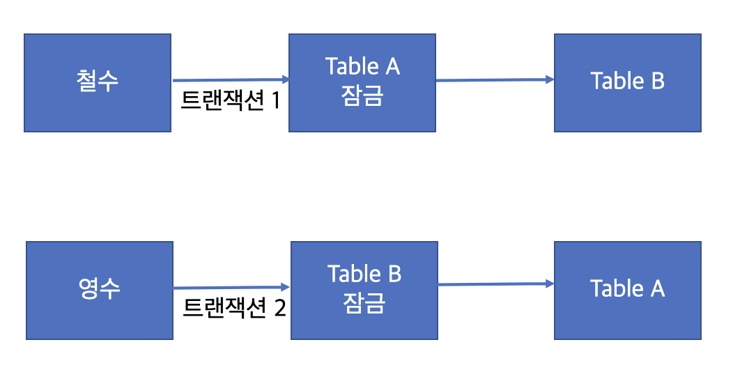 - 아래 예시처럼 각각의 트랜잭션이 A, B를 각각 잠그고 서로 잠근 테이블에 요청할 경우 데드락(무한대기현상)에 빠지게 된다.