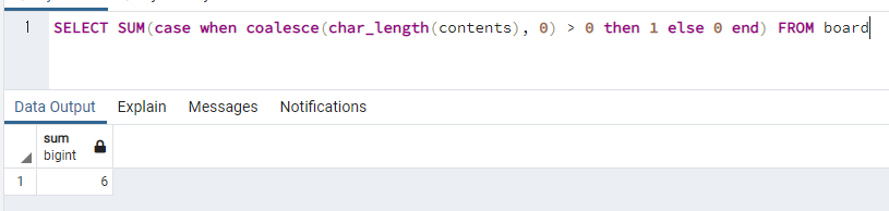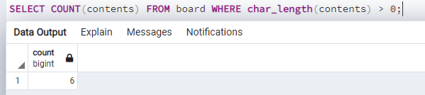 위 테이블에서 contents에 내용이 있는 것들의 개수를 알아보기 위해 COUNT를 사용한다.