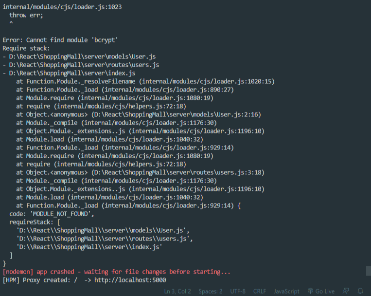 오류는 당연히 'bcrypt'가 제대로 설치돼지 않아 발생하는 거라는데