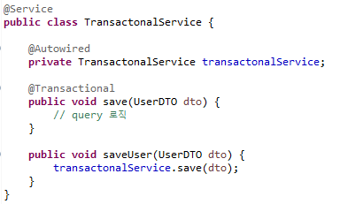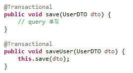 위와 같이 saveUser를 통한 this.save 호출 시 @Transactional이 동작하지 않는다.