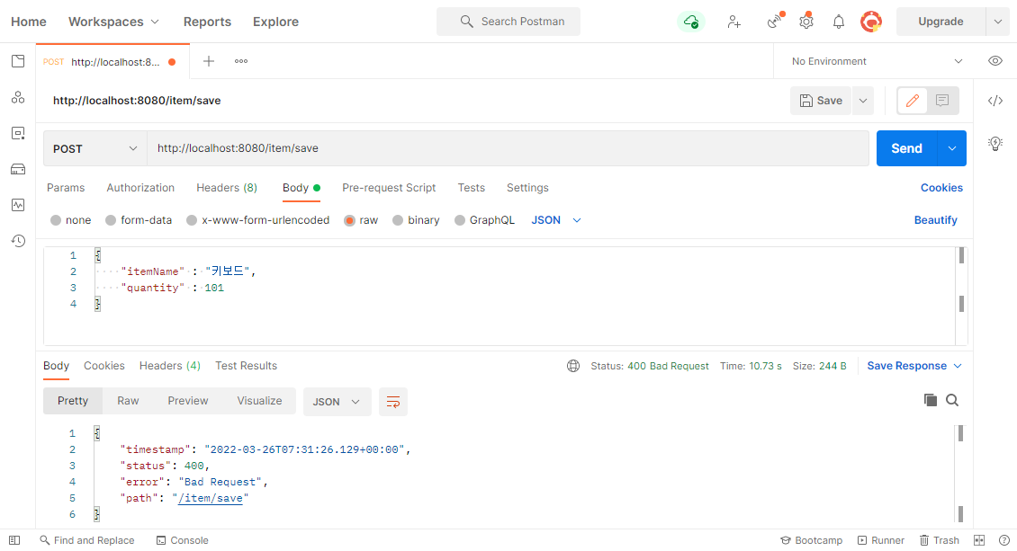 .v.h.CustomMethodArgumentNotValidHandler : ['id' is 'null' :: 널이어서는 안됩니다], ['quantity' is '101' :: 100 이하여야 합니다]