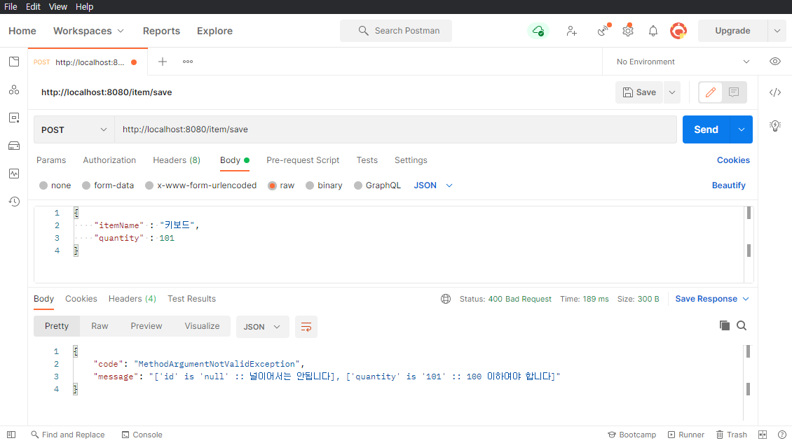 .w.s.m.s.DefaultHandlerExceptionResolver : Resolved [org.springframework.web.bind.MethodArgumentNotValidException: Validation failed for argument [0] in public org.springframework.http.ResponseEntity<java.lang.String> com.verification.controller.item.ItemController.save(com.verification.domain.item.ItemDTO) with 2 errors: [Field error in object 'itemDTO' on field 'id': rejected value [null]; codes [NotNull.itemDTO.id,NotNull.id,NotNull.java.lang.Long,NotNull]; arguments [org.springframework.context.support.DefaultMessageSourceResolvable: codes [itemDTO.id,id]; arguments []; default message [id]]; default message [널이어서는 안됩니다]] [Field error in object 'itemDTO' on field 'quantity': rejected value [101]; codes [Max.itemDTO.quantity,Max.quantity,Max.java.lang.Integer,Max]; arguments [org.springframework.context.support.DefaultMessageSourceResolvable: codes [itemDTO.quantity,quantity]; arguments []; default message [quantity],100]; default message [100 이하여야 합니다]] ]