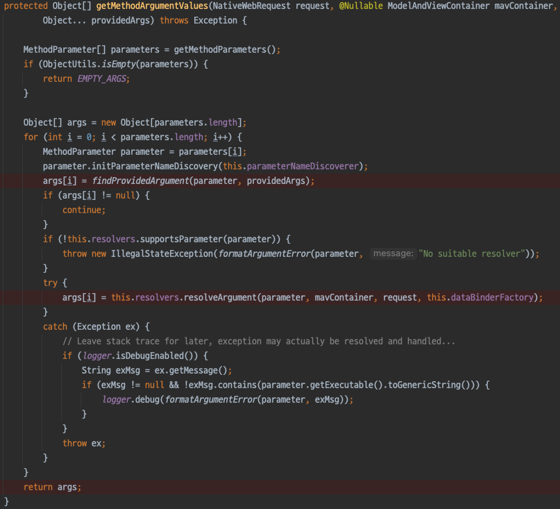 findProvidedArgument() : exception 을 처리할 때 args를 처리하는 것 같습니다. (이건 좀 더 알아봐야될 것 같습니다.)