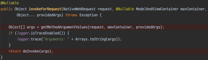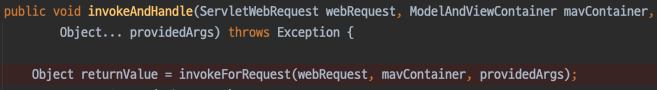 invokeForRequest() : 핸들러(컨트롤러)를 실행하고, 리턴 값을 받습니다.