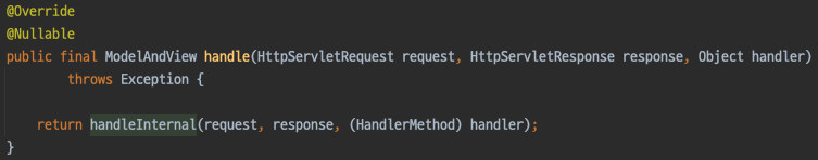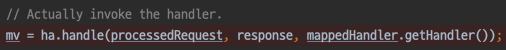 1. 찾은 핸들러 어댑터의 handle() 메소드를 실행시킵니다.