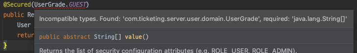 @Secured 애노테이션의 value는 String[] 를 받도록 정의되어 있기 때문에 enum 값을 받지 못합니다.